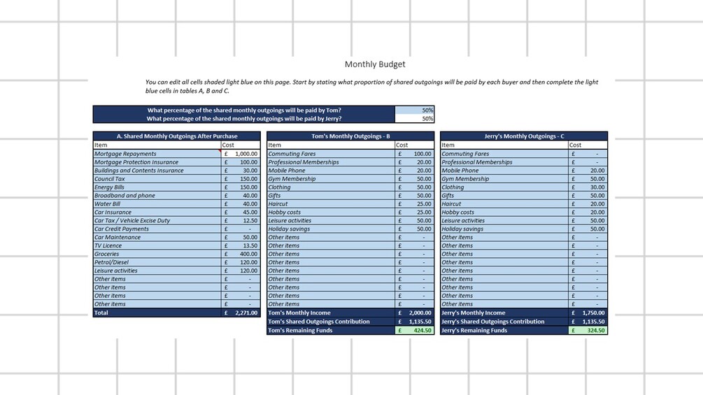 This spreadsheet is designed for two buyers sharing the cost of a purchase in the UK, but all of the item rows are editable so you can specify e.g. the taxes and fees applicable in your nation. You can specify how you intend to split your monthly outgoings, for example, if one of you earns more and pays a proportional share for your outgoings. If you are a single purchaser buying alone you can still use this sheet. I'll add a single-buyer version of the sheet to the shop soon.